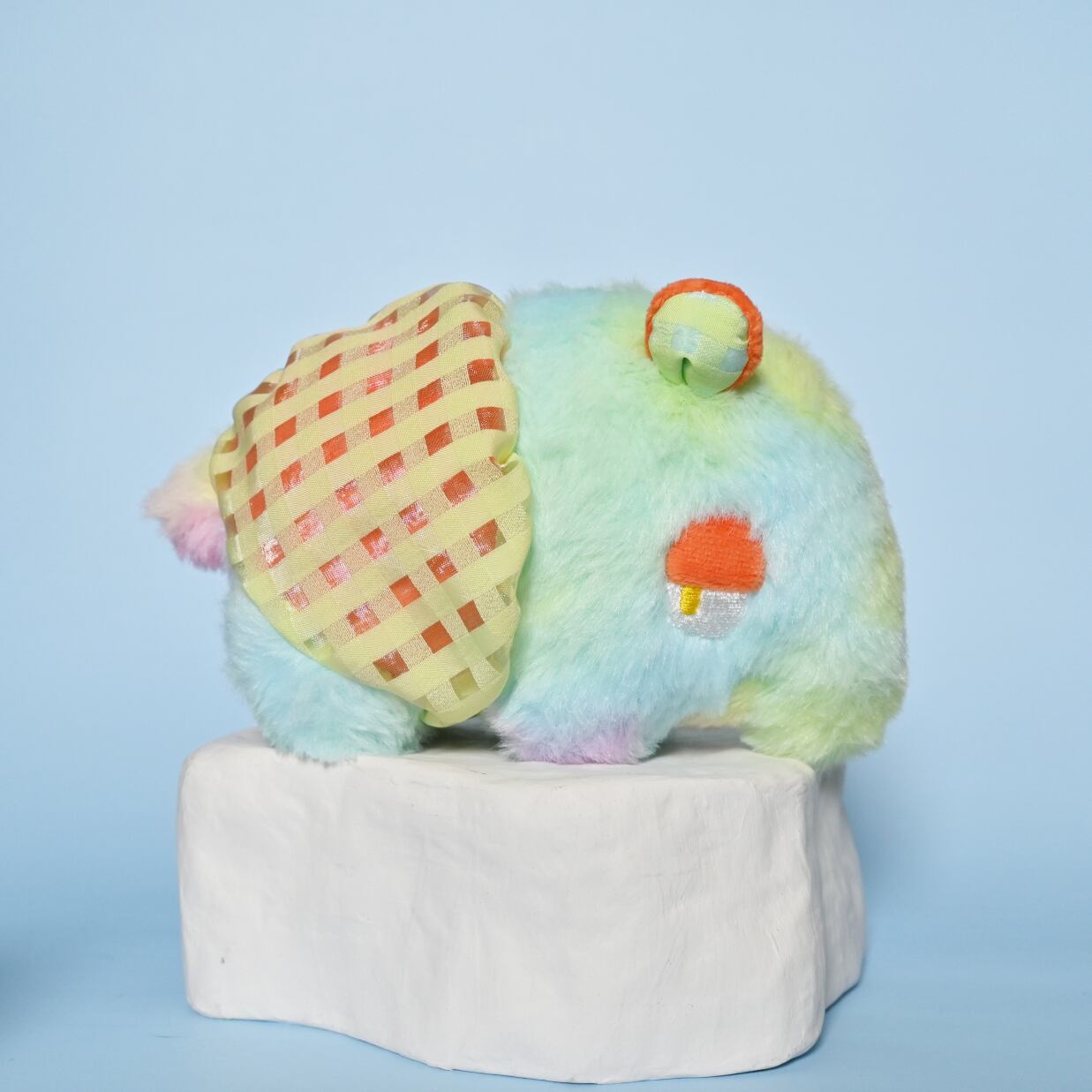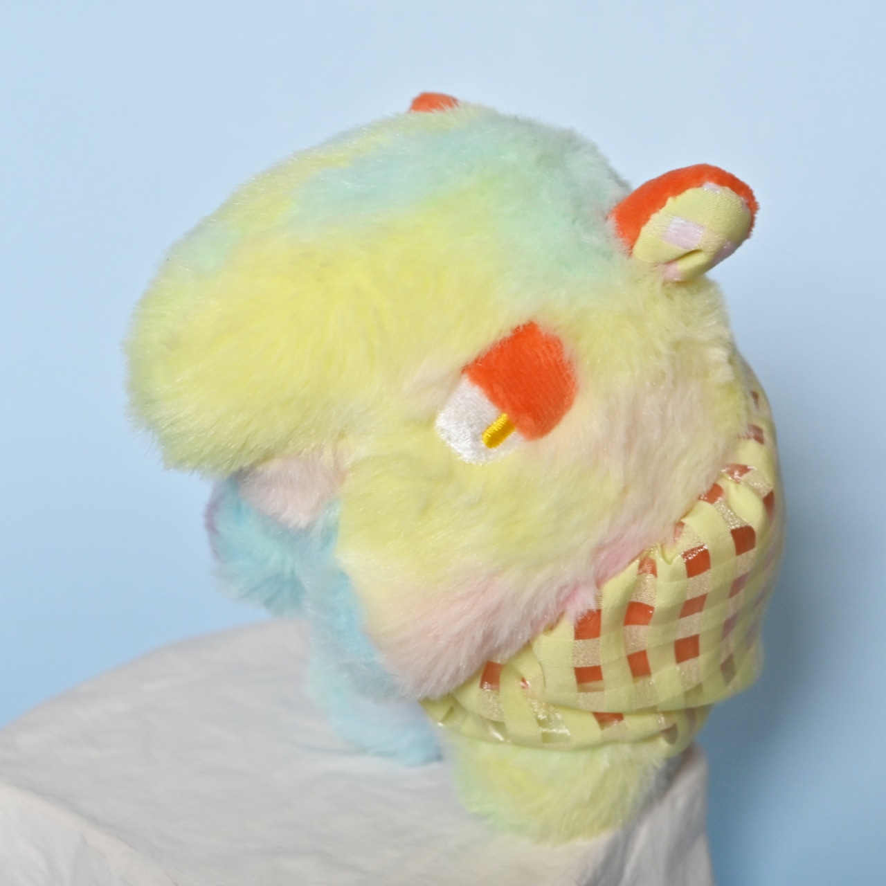 オレンジパンツの上に、黄緑色のチェックのオーガンジーのぶかぶかパンツを履いた、虹色の獏さんです。