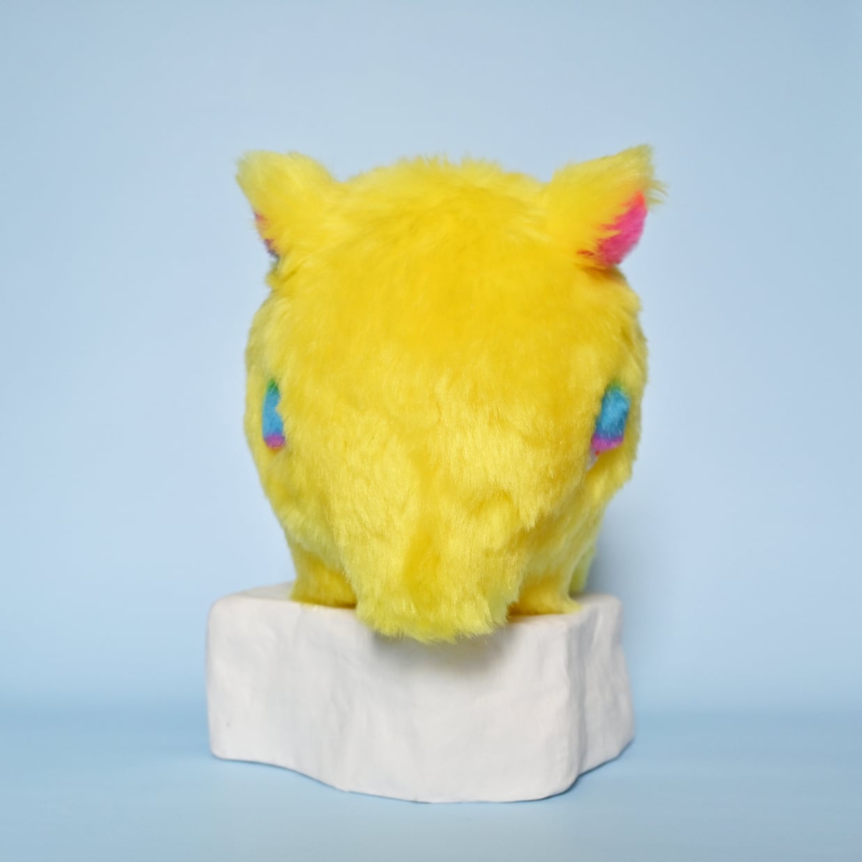 虹色パンツの上に、白色の水玉オーガンジーのぴちぴちパンツを履いた、もふもふした黄色い獏さんです。